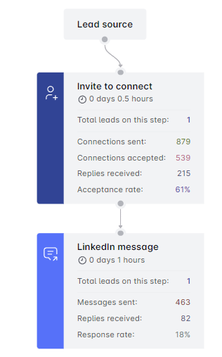 Scroll down for a detailed breakdown of each campaign step. See how many connections were sent, replies received, and emails/messages dispatched by Snyper. It varies based on your campaign type and the steps included. Easily spot where your leads stand in the campaign.