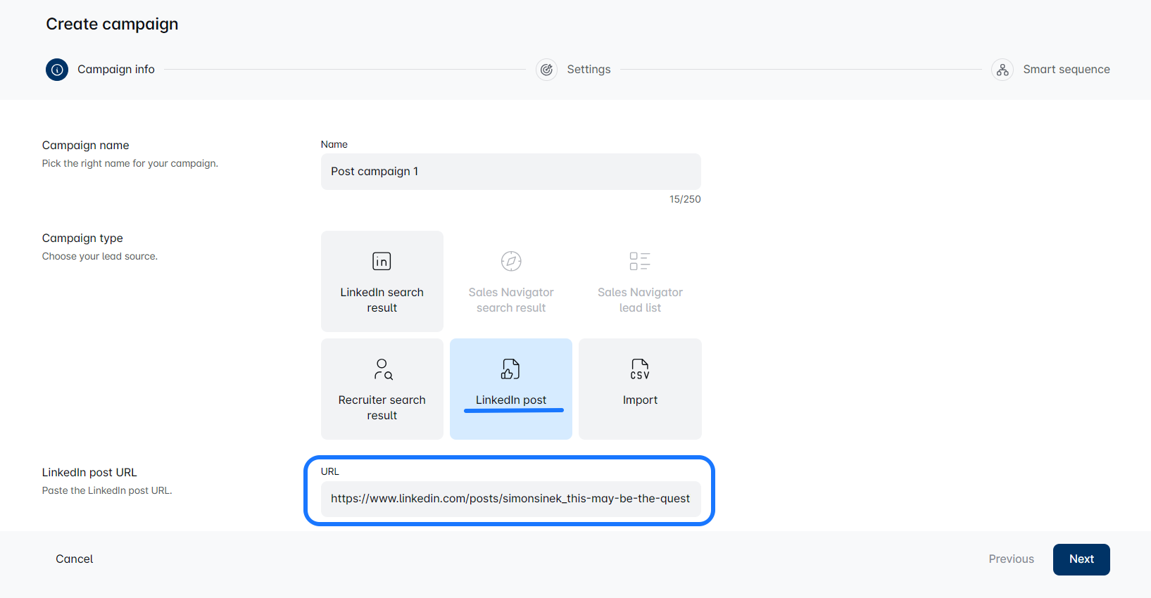 Maximize your reach using the Snyper’s Post Engagement campaign! Target LinkedIn users interacting with relevant posts, and connect with an audience already interested in your industry. Simply find an engaging post, copy the link, and paste it into your dashboard. Personalize your outreach to foster connections and increase conversions. Ready to elevate your campaign strategy? Dive in and start connecting! 🌱🚀