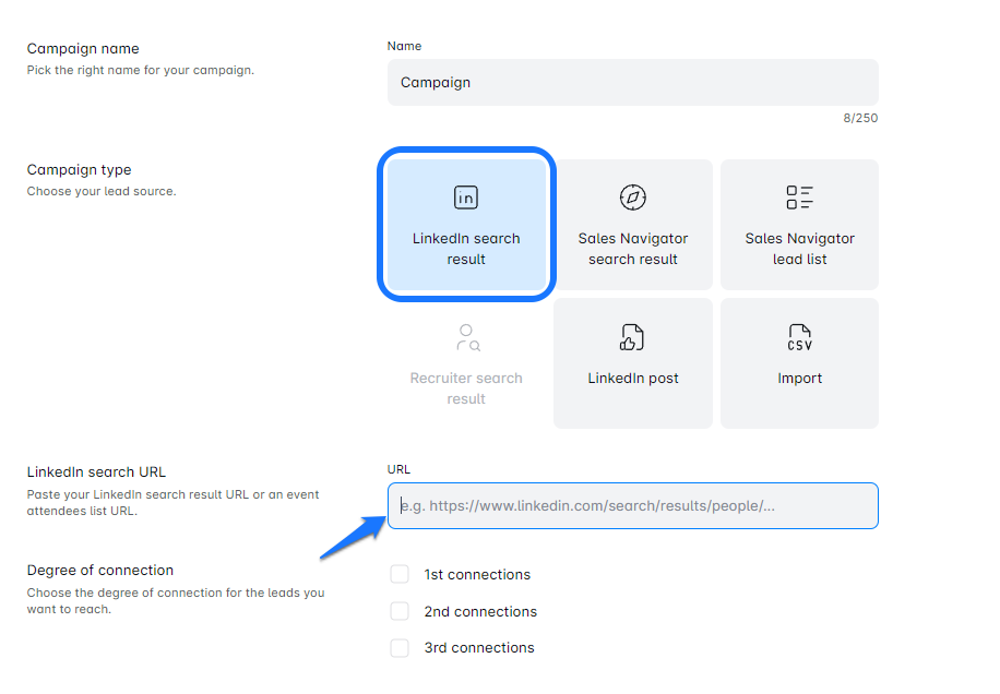 In Snyper, paste your LinkedIn search URL into the designated area. Give your campaign a name that resonates with your goals.